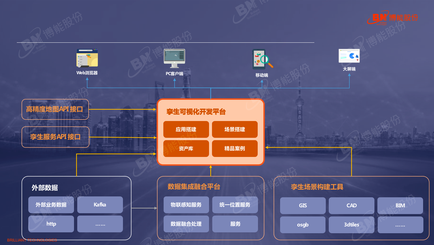 博能股份搭建的数字孪生平台,为全行业提供了高效易用的数字孪生可视化开发引擎,包括一系列配套的工具组件和模型资源,为没有专业数字孪生可视化团队的公司提供端到端技术解决方案,大幅降低了数字孪生应用的开发门槛,省去了建模、开发、实施中大量重复性的基础工作,节约了成本投入,可以让合作伙伴能够低门槛、高效率地开发出自己的数字孪生应用和数字孪生场景。