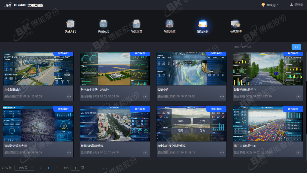通过该平台,用户可导入博能孪生场景构建工具中的三维场景,在场景中通过拖拽的方式在场景中添加模型、绑定模型数据,拖拽可视化平台中内置的行业组件、交互组件等多种交互组件,按照需要设置组件的属性、数据、交互方式,构建个性化可视化平台应用。具有学习难度低、操作简单、组件搭配灵活等优势。孪生可视化开发平台同时为用户内置了多款经典案例,覆盖了多种行业的不同应用场景,引用经典案例模板为用户节约应用设计时间、提升应用质量,以此帮助客户实现对自身业务数据背后价值的快速洞察。