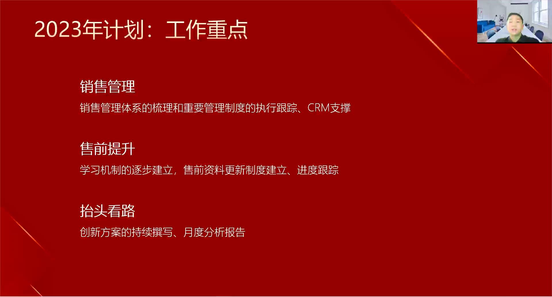博能股份副总裁兼营销中心总经理周院进在线上进行了发言。周总表示,过去的一年是尤其难忘的,面对复杂的国内外形势,在困境之下,我们在重点机场客户上有了新的突破,在重点项目上也有了新的进展。销售管理体系更加完善,为后续扩大团队奠定了基础,也为新的一年做了很多积累。展望2023年,营销中心将在销售管理、售前提升、创新方案等方面进行持续改善,为新一年目标的达成提供动力。