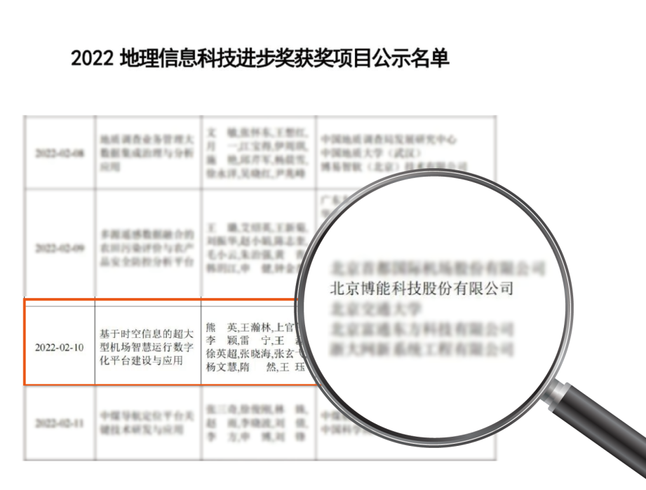 2022年7月13日,中国地理信息产业协会公布2022地理信息科技进步奖评选结果,北京博能科技股份有限公司联合北京首都国际机场股份有限公司、北京交通大学等单位共同申报的《基于时空信息的超大型智慧运行数字化平台建设与应用》项目,荣获2022地理信息科技进步奖二等奖。