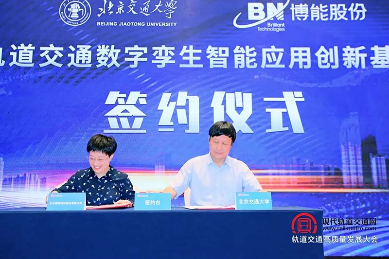 5月26日上午,借助本次中国城市轨道交通高质量发展大会召开的契机,北京博能科技股份有限公司与北京交通大学在大会上举行了“轨道交通数字孪生智能应用创新基地”签约仪式。作为双方签约代表,北京交通大学计算机与信息技术学院教授、博导,高速铁路网络管理教育部工程研究中心主任,北京交通大学牵头承担的国家重点研发计划项目“基于人工智能技术的创新创业服务技术集成研发与应用示范”项目负责人刘峰教授,北京博能科技股份有限公司副总裁兼成都博能数智科技有限公司总经理齐焕然,共同签署了“轨道交通数字孪生智能应用创新基地”合作协议。该合作协议的签署意味着,双方将充分发挥各自优势,尤其是博能股份在数字孪生领域的技术优势,以及北京交通大学在高铁信息化、智能运维等方面的科研优势,依托高速铁路网络管理教育部工程研究中心在网络管理与信息安全技术领域的研发能力,以及北京交通大学软件评测实验室在软件产品及信息系统工程质量检测方面的能力,整合各方有效资源,联合开展重大科技攻关、科研成果转化,以及创新性人才培养等工作。