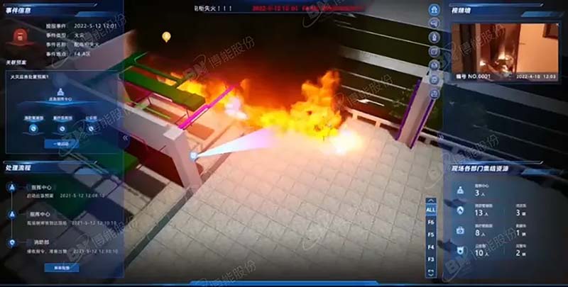 安全应急管控:应急事件及预案管理,通过多源融合感知识别不安全事件或危险源在孪生场景中自动预警/报警,例如火灾探测器探测火灾、视频AI分析异常聚集等,系统可一键关联预案启动应急处置流程,向移动终端发送指令消息,规划撤离路径,调取实时视频,协同指挥调度,安全管控“一盘棋”,提升应急处置效率,降低损失。