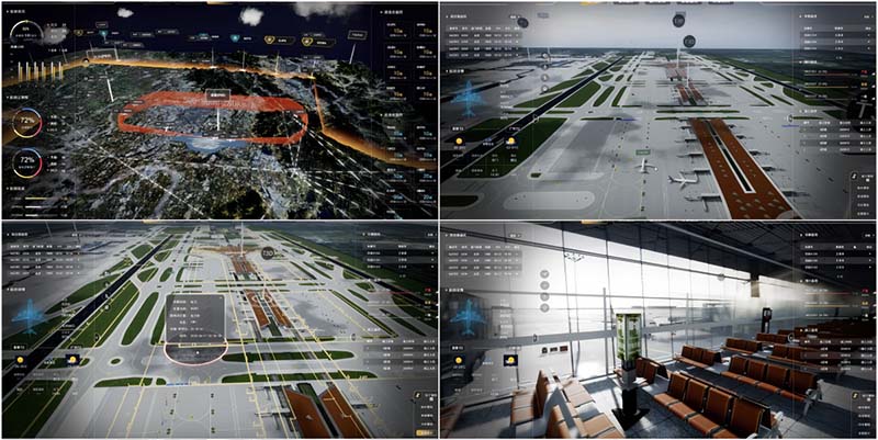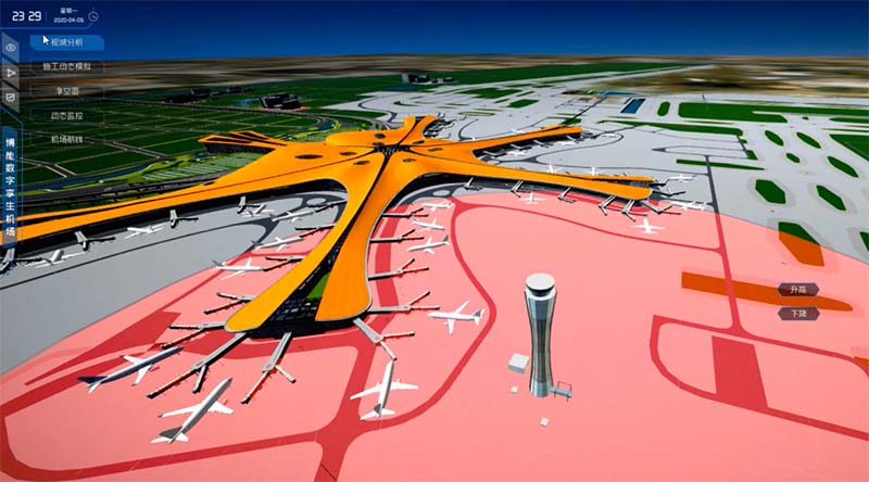 提供生产运营可视化监管平台:通过数字孪生系统,为机场各级管理人员提供包括机场周围空域航路、飞行区场面活动、航站楼值机/安保、公共区交通、地下管线状态的全方位生产运行情况的综合可视化监管平台,便于管理者实时掌握机场的运行状态和资源使用情况。如,北京首都国际机场对空域、通过平台对地表、地下、室内等进行数字孪生呈现,进行可视化监管。