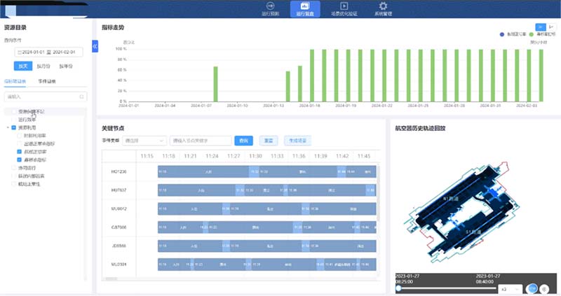 提供生产运行优化平台:构建基于时空和航班信息集成为一体的机场生产运行仿真优化工具,依据情景分析管理方法论,实现主动发现机场运行问题、优化问题、虚拟验证、对比优化报告的业务流程。如,西安咸阳国际机场。