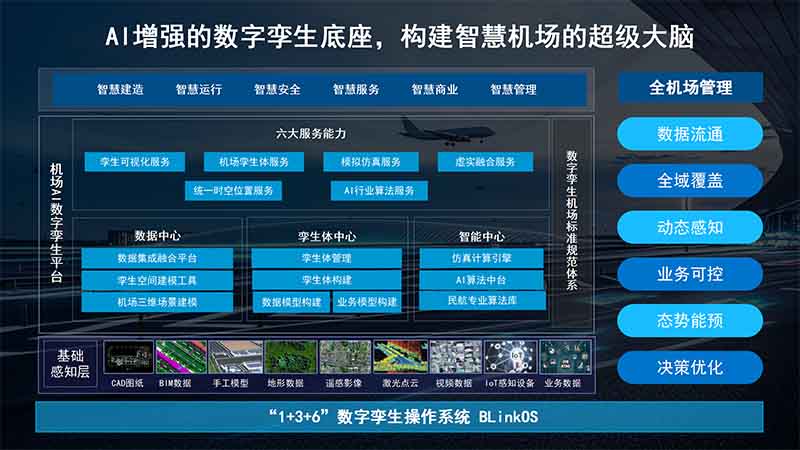 基于博能股份的BLinkOS数字孪生操作系统,融合AI的数字孪生底座具备强大功能,不仅可实现机场全要素数字化,能支持近百种不同来源和格式的数据导入,利用生成式AI 3D重构技术快速构建机场场景,内置大量民航行业模型资产,实现动态多源业务数据集成融合。同时,利用人工智能技术,可对接入的各类数据进行智能识别、智能算法分析、智能研判、智能预测,辅助机场管理者做出更科学、更高效、更合理的管理决策。实现机场数据流通、全域态势感知、仿真推演、资源管理与辅助智能决策。