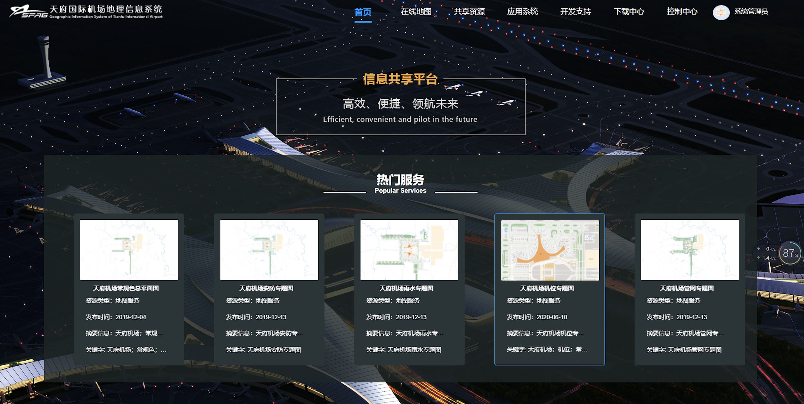 地理信息系统(GIS系统)以机场地理信息库为基础、以空间位置应用服务为目的,为成都天府国际机场提供空间位置服务标准规范(包括工程内容管理标准规范、地理信息系统标准规范等内容),同时,为全机场生产及管理类的信息系统提供统一的、标准的地理坐标信息、地图服务和地图数据。