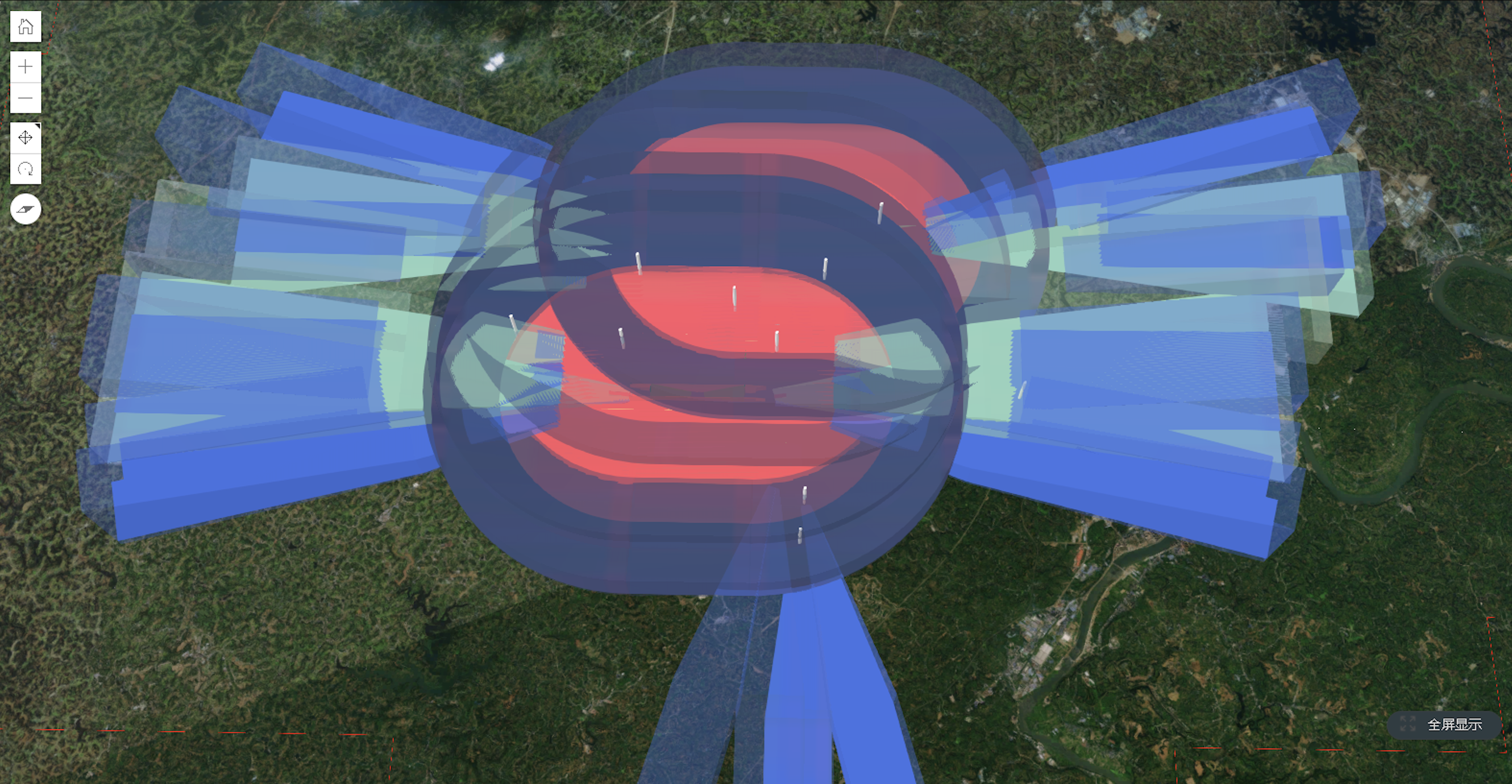 净空管理系统采用三维建模的方法,以数字地形模型为核心,创建出虚拟的机场净空限制面模型,将建好的模型精确定位到三维场景中,以可视化方式支撑机场管理人员对机场净空的管理。