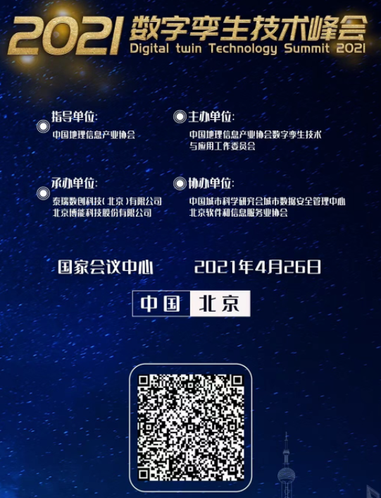 4月26日,2021数字孪生技术峰会在北京国家会议中心隆重召开。会议由中国地理信息产业协会指导,中国地理信息产业协会数字孪生技术与应用工作委员会(以下简称数字孪生工委会)主办,泰瑞数创科技(北京)有限公司、北京博能科技股份有限公司承办,中国城市科学研究会城市数据安全管理中心、北京软件和信息服务业协会协办。全国政协委员王春峰,中国工程院院士刘先林,中国地理信息产业协会会长孙玉国,数字孪生工委会顾问王明孝,数字孪生工委会主任委员刘俊伟、王珏出席会议。近400名专家及从业者参加线下会议,近5万人次通过线上直播方式参加会议,共同探讨数字孪生时代的挑战与机遇,以及数字孪生技术在新基建、新型基础测绘等领域的技术融合与应用创新,推动地理信息产业高质量发展。