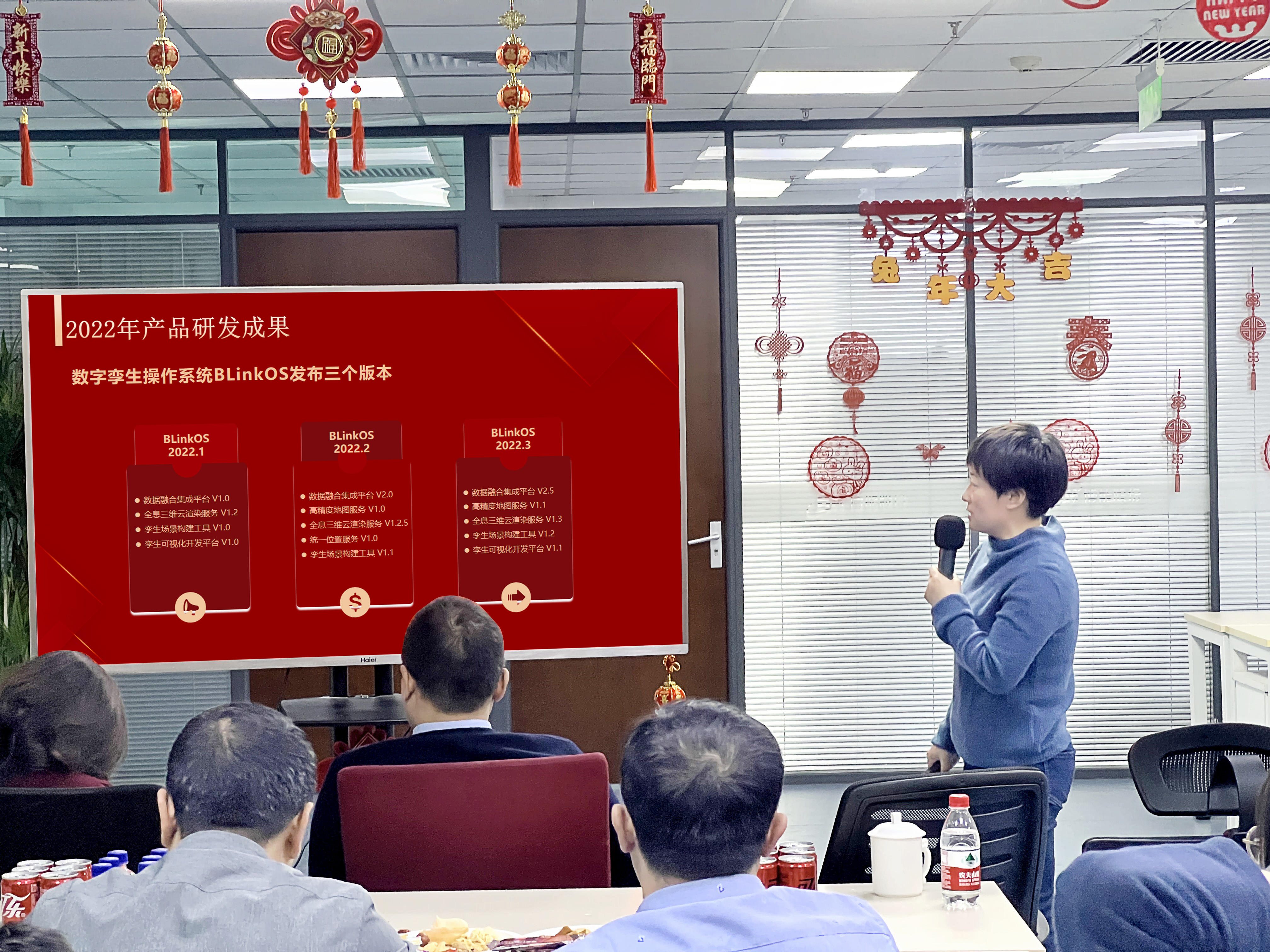 年会开始,博能股份董事长兼总裁王珏致辞。王总表示,在过去的一年,博能股份在取得收获的同时也面临着巨大的挑战。博能股份在2022年成立了元宇宙与地理空间信息工作委员会、博能股份成都子公司,重磅发布了数字孪生操作系统BLinkOS2022.1,获批国家级专精特新小巨人企业,开拓了在智慧水利、智慧城市、智慧交通、智慧能源等领域的新项目。凭借着丰富的经验、专业的能力和真诚的服务,收到了多家客户的表扬信。面对市场竞争加剧的2023年,博能股份将持续推动组织创新力,提升人效,深耕产品研发,提供数字孪生应用快速搭建的一站式服务,打造新基建的数字化基础设施,赋能全行业数字化转型和智能化升级。
