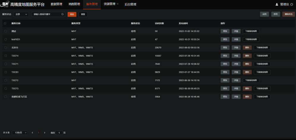 OGC服务(MVT、WFS、WMS、WMTS等)的发布、暂停、启用等。